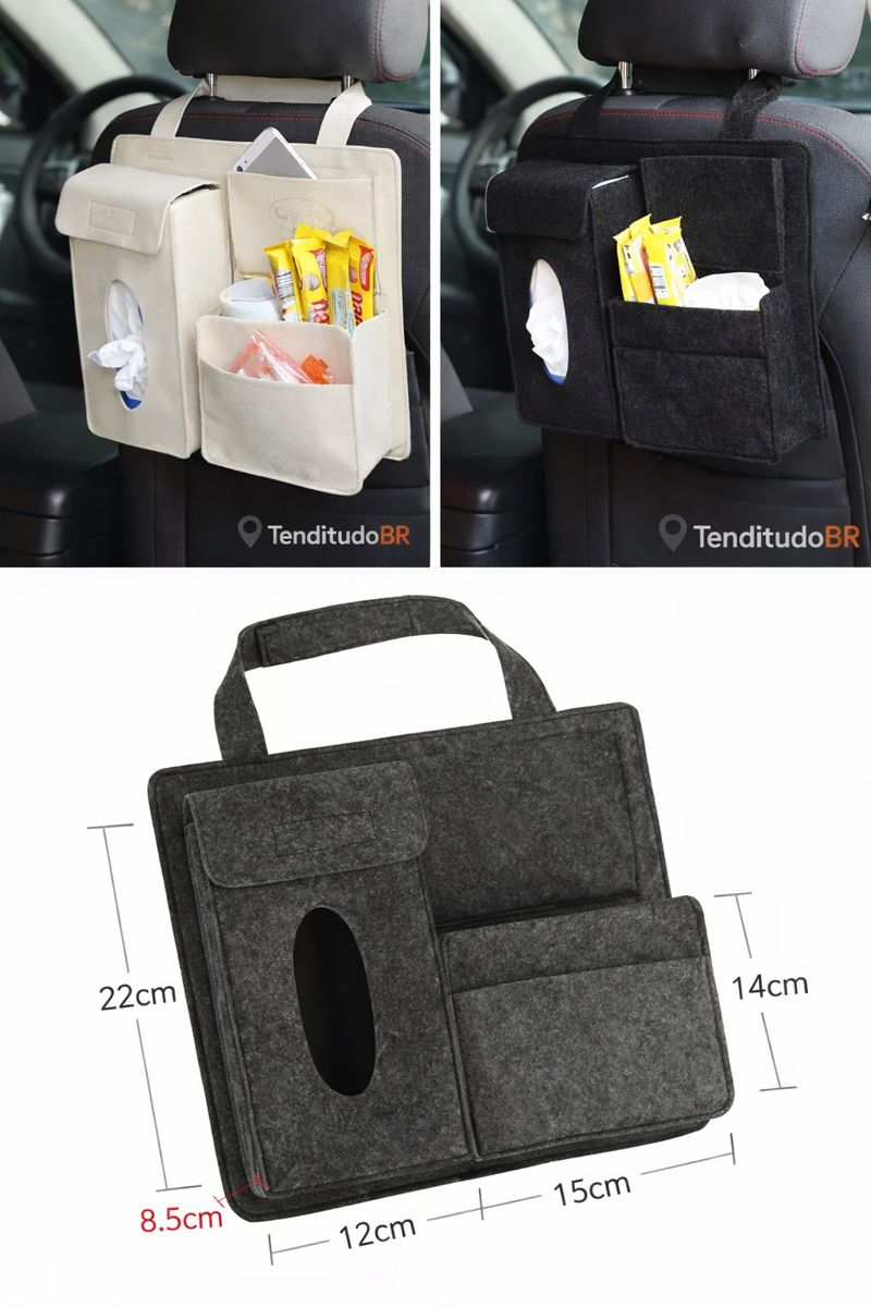 Com 32 x 28 x 8,5 cm, ele organiza bastante coisa sem ocupar espaço demais, mantendo o carro confortável para quem vai atrás.