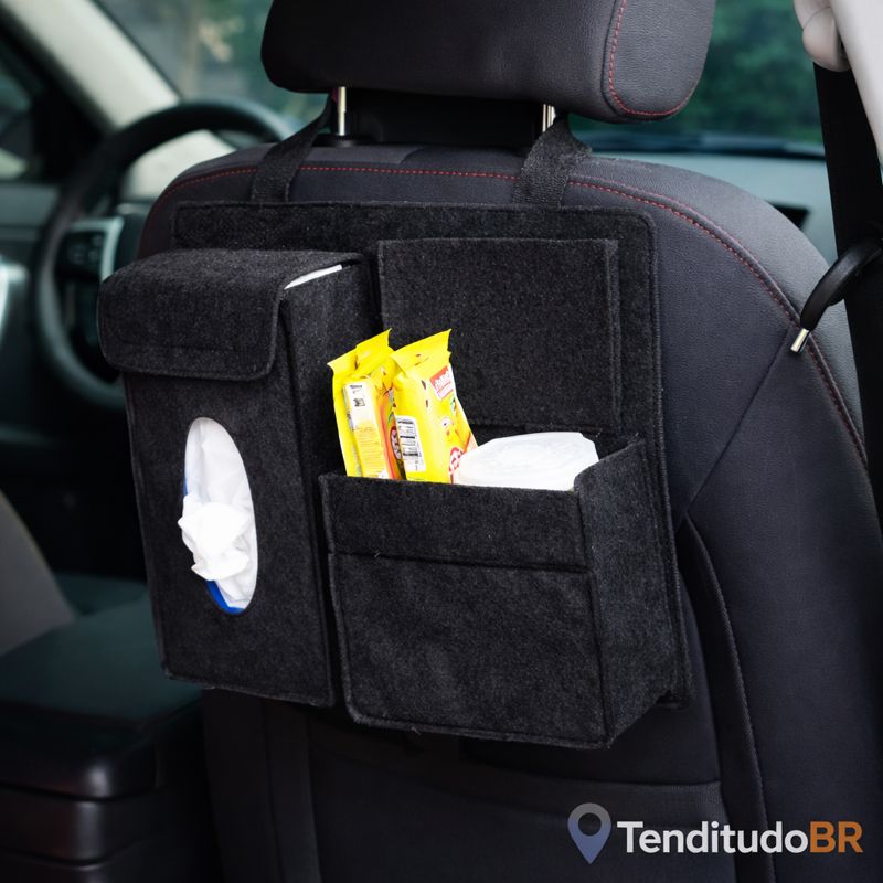 Sabe a bagunça de celular, garrafinha, lanchinho, papéis e objetos soltos? Esse organizador fica pendurado no encosto e cria um “ponto fixo” para guardar o essencial, sem espalhar nada pelo carro.