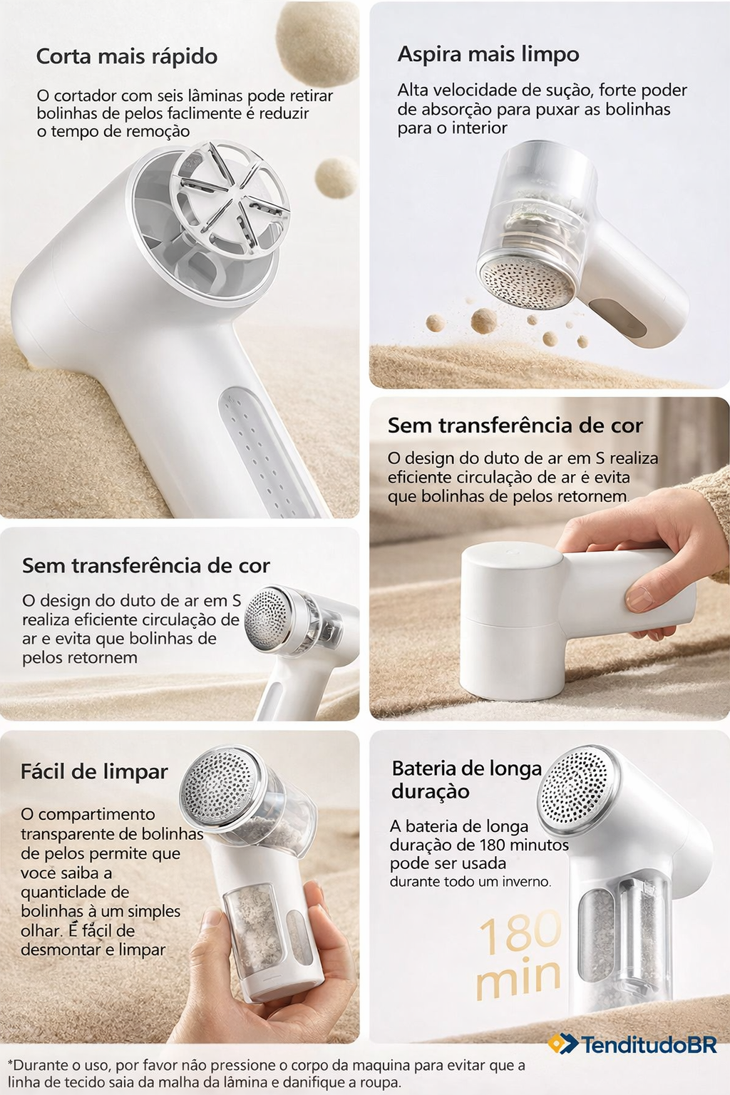• Roupas e Camisolas:Remova fiapos e cotão de suas roupas e blusas com facilidade.