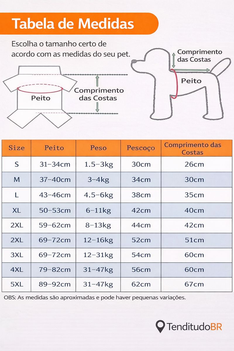 Vários tamanhos (S ao 5XL): mais chance de vestir bem no corpo do seu pet